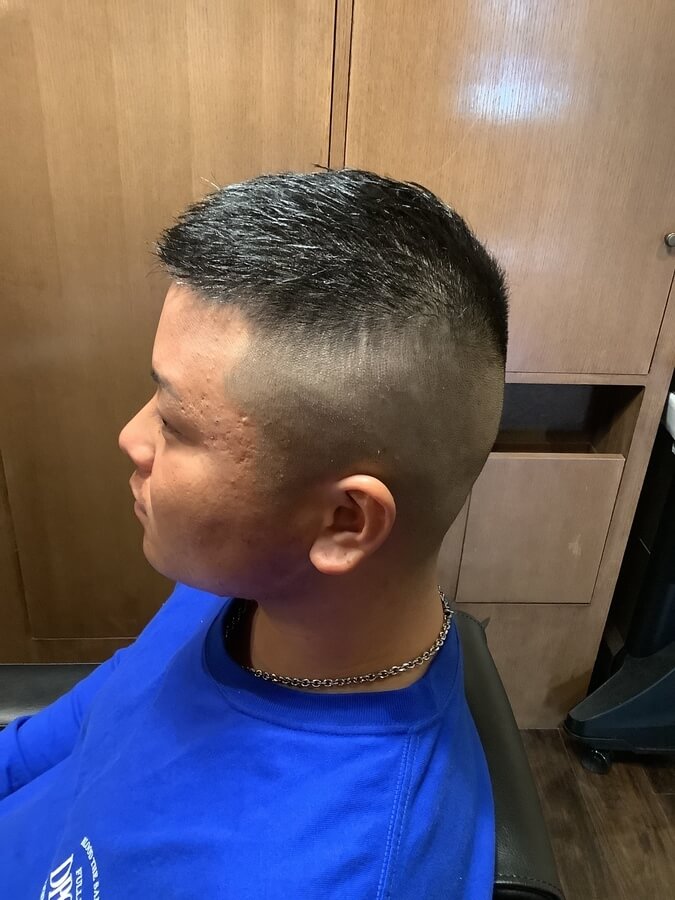 裾周り0.3mmスタートの高めフェード&トップ短めのアップバングスタイルです。刈り上げのmm数を変えたり、トップをもっと短くしたりするなど、自分好みのスタイルにもアレンジ可能!