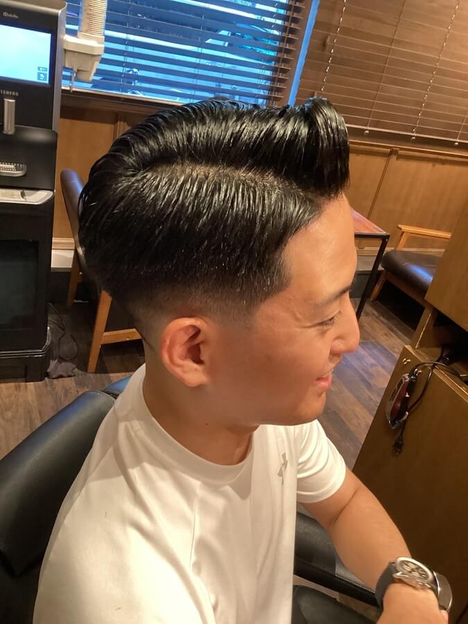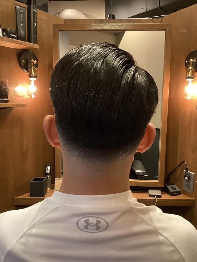 もみあげと裾周りを0.3mmでスタートした、低めのフェードスタイルです。大人の男の上品さが漂う、スッキリとしたカッコよさがたまりません。ミドル・シニアの方にも人気です。