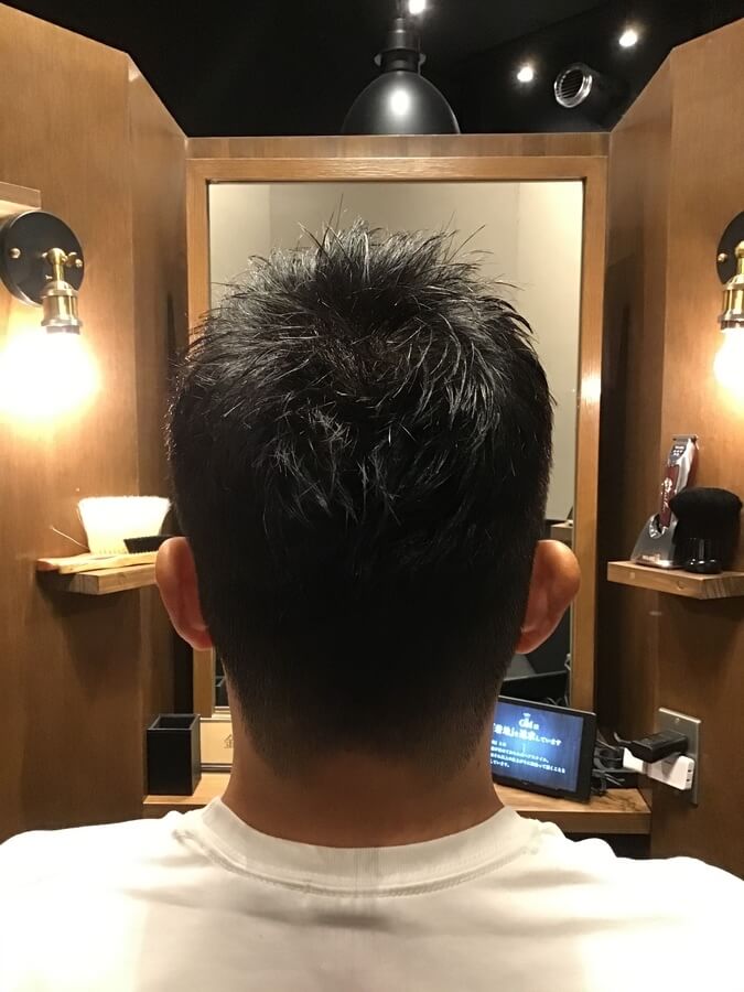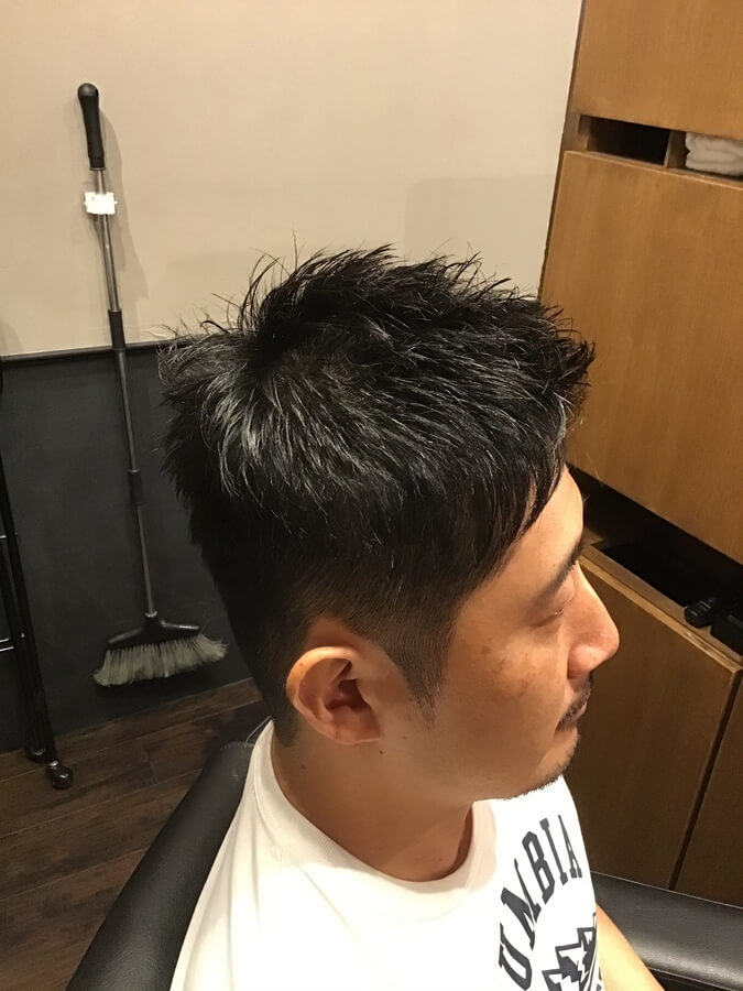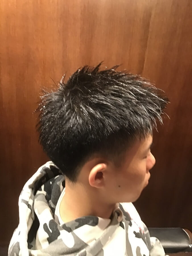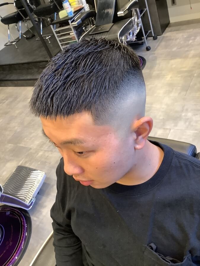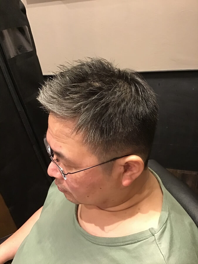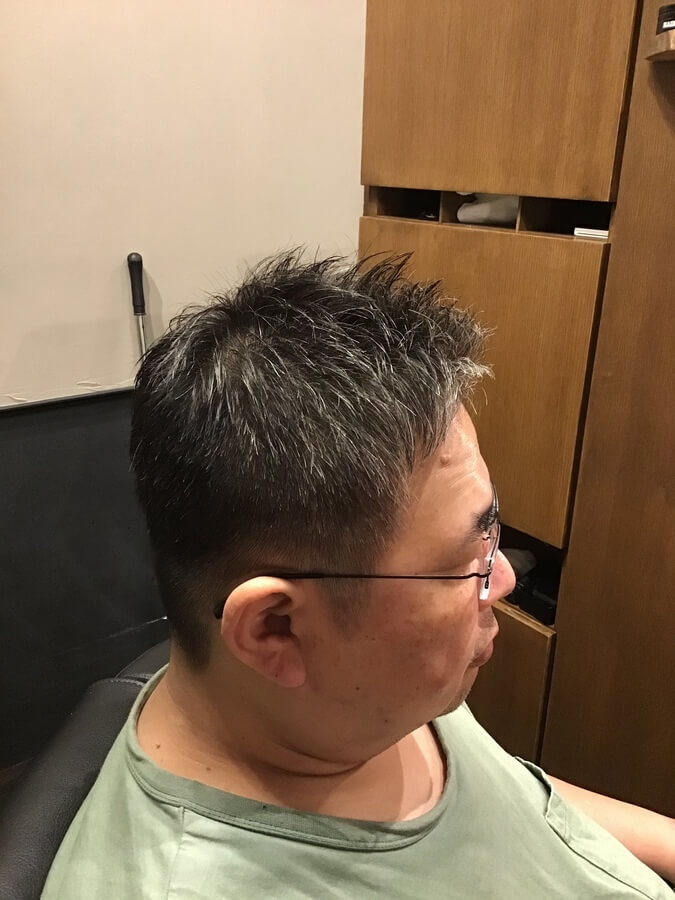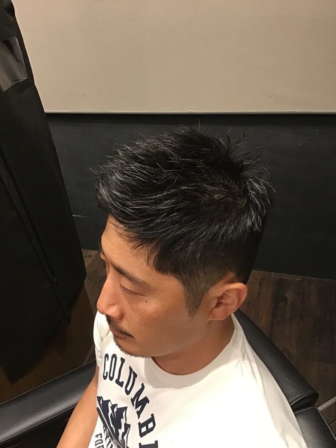 3mmのグラデーションをつけた刈り上げスタイルです。前髪や顔周りに長さを残しているため、前髪を上げても下ろしても大丈夫な2wayスタイル。