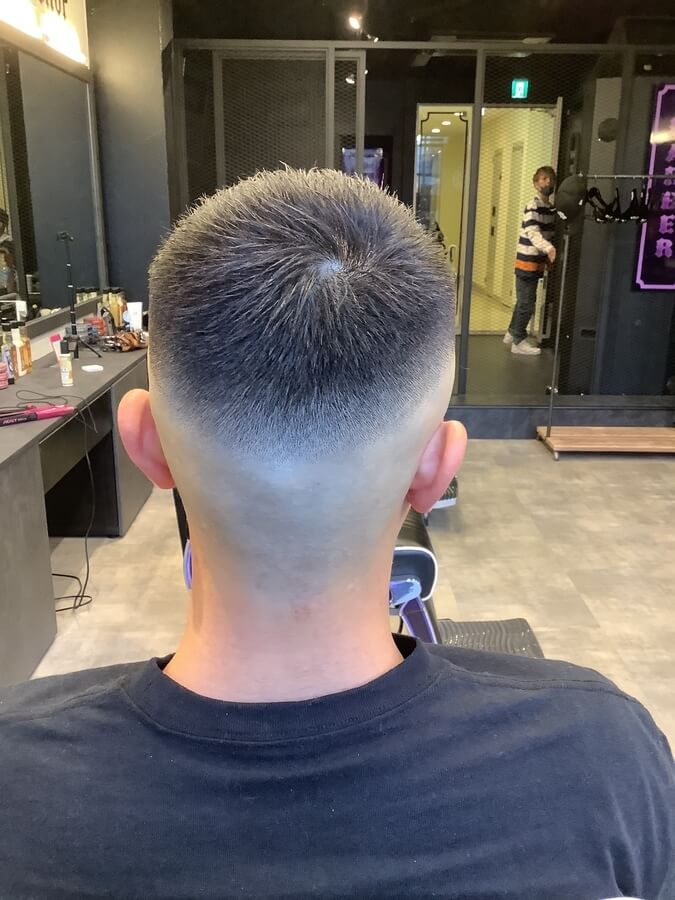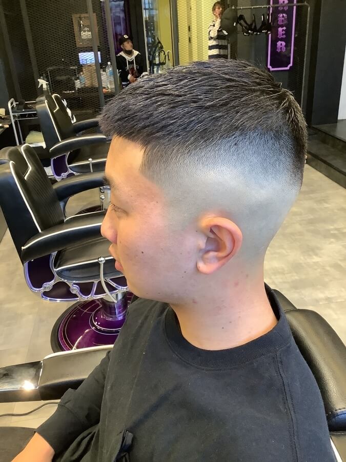 このスタイルのように0mmのスキンフェードにすると攻めた印象のスタイルになりますが、フェード部分を2~3mm残しておくと、ビジネスシーンでもOKなスーツに似合うスタイルになりますよ。