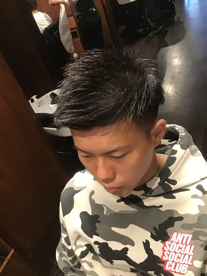 前髪と長めに残したトップをしっかりと立たせ、ボリュームを出した攻め系スタイル。若い方に人気です。