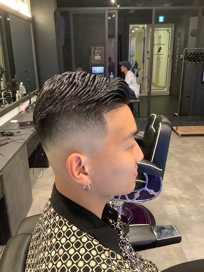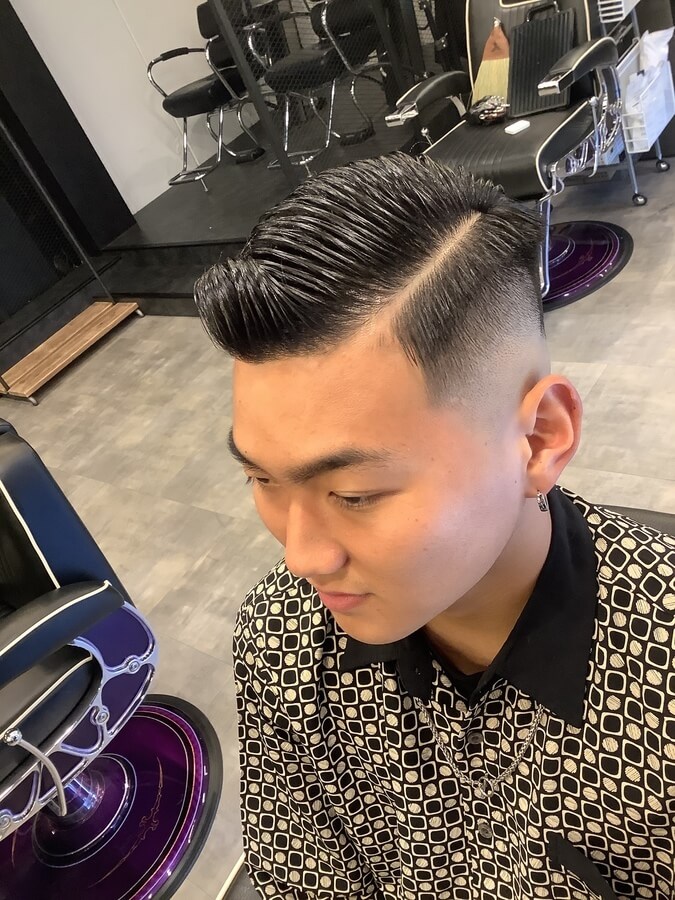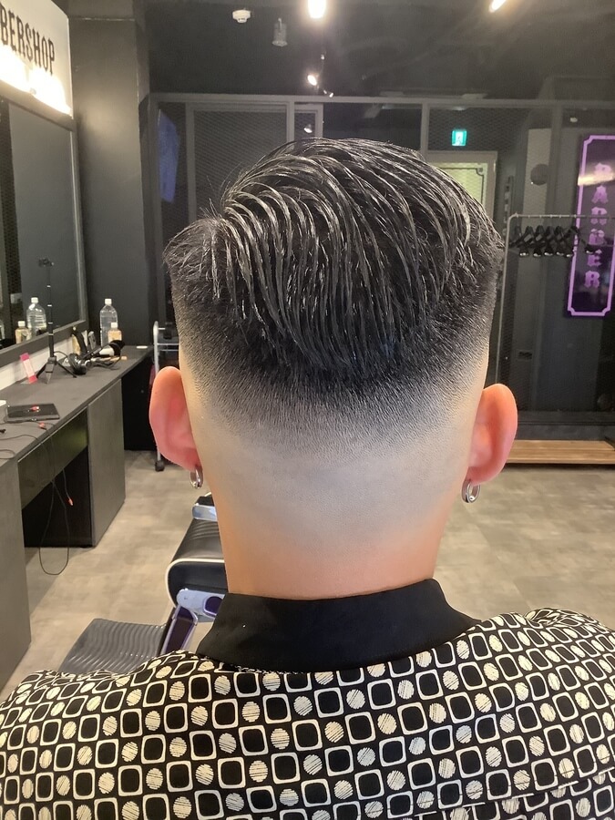 下はスキンフェード&上は流す感じに仕上げた、最新バーバースタイルです。サイドとバックは短く刈り上げ、トップは長めに残して流しているため、髪が全く邪魔になりません。上の髪の流す方向や分け目は、つむじの位置や流しやすさなどによって変わります。