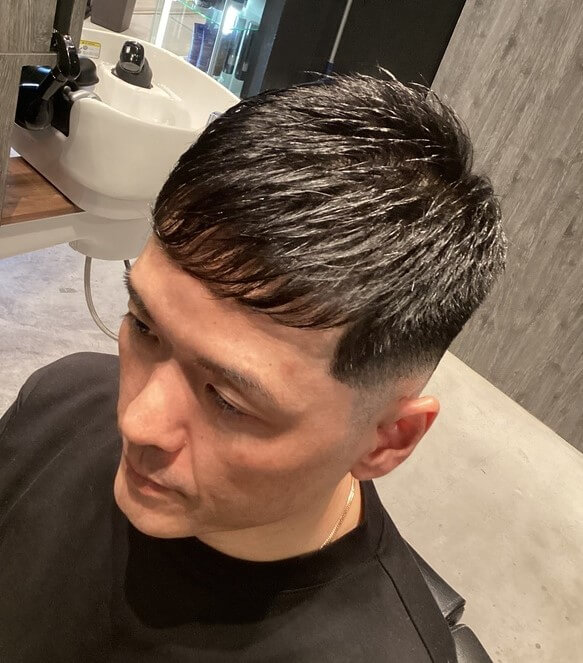 サイドはツーブロックで、バックは3mmの刈り上げ、前髪は七:三でアップバングにしたスッキリとカッコいいスタイルです。カジュアルになりがちな夏服にも合わせやすく、落ち着いた大人の男の印象を与えます。