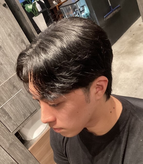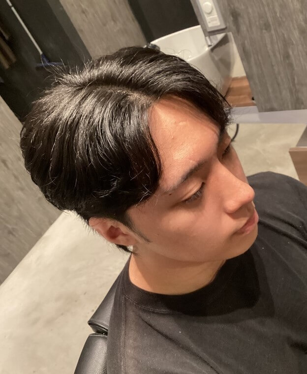 襟足長めのセンターパートスタイル。サイドは6mmのツーブロックで、トップとバックが長めでサイドがスッキリしたスタイルです。